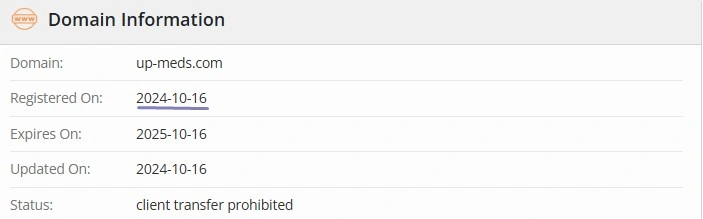The first part of our analysis of the company is to evaluate its domain information. According to a whois search we did on whois.com, we discovered that up-meds.com was registered in 2024/10/16. And it is yet to be reviewed and updated since the day it was created. Also, the date of expiry is set for 2025/10/16, of which we don’t know if the company will continue to exist till then.